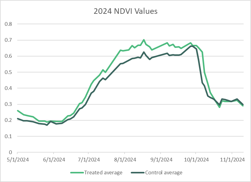 The treated field maintained higher NDVI values than the control throughout the entire season, indicating higher amounts of biomass accumulation.